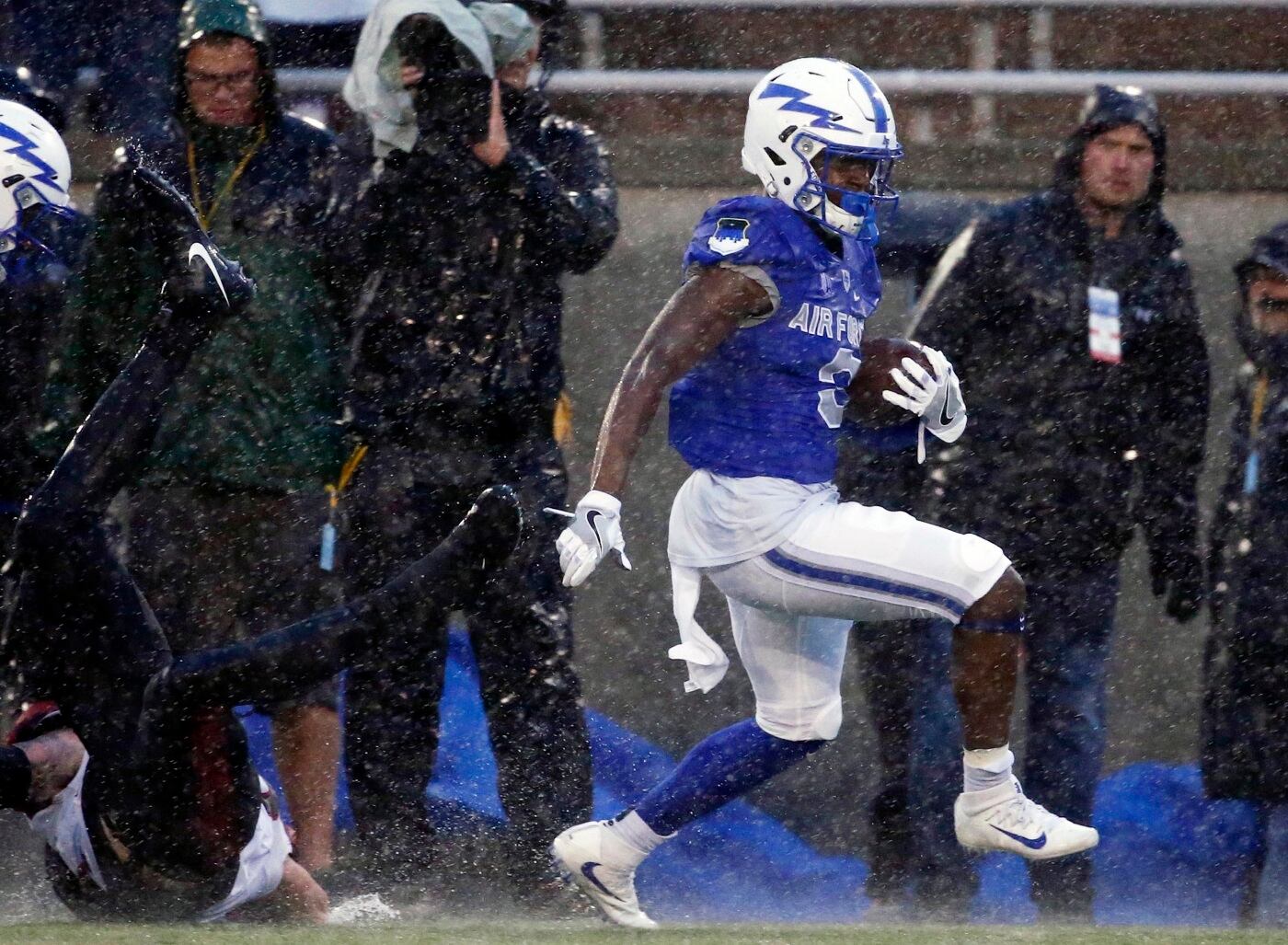 The rain played a starring role early. The shower was steady at kickoff and grew more intense with every wind gust. The conditions led to a botched extra point by Air Force, a punt from San Diego State that traveled only 17 yards and conservative play calling. The Falcons led 9-0 when the game was halted and the teams sent to their locker rooms.