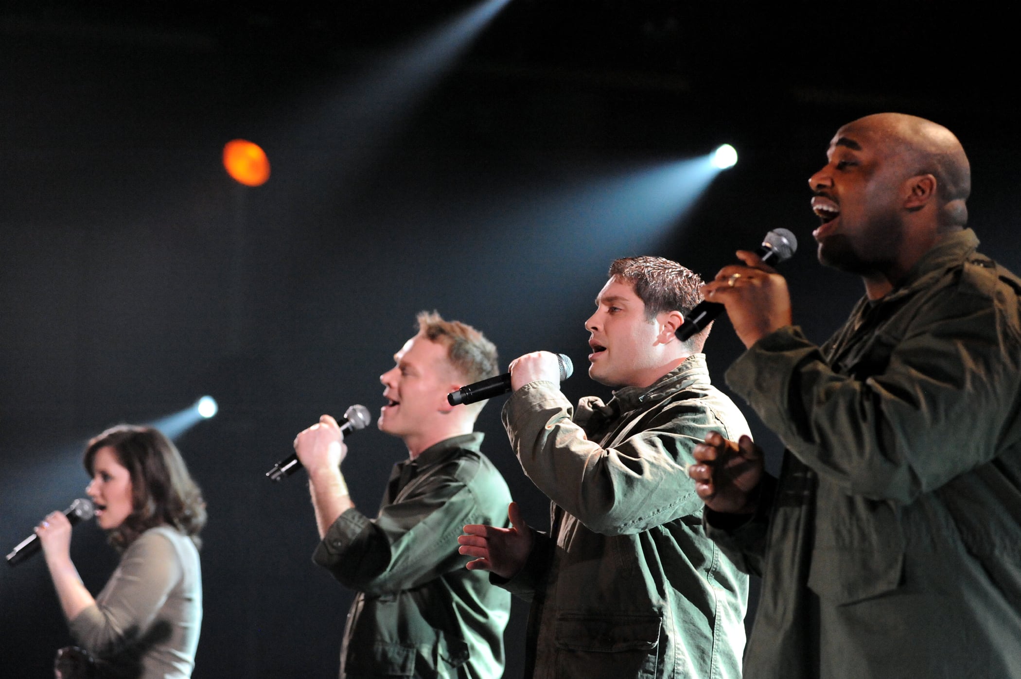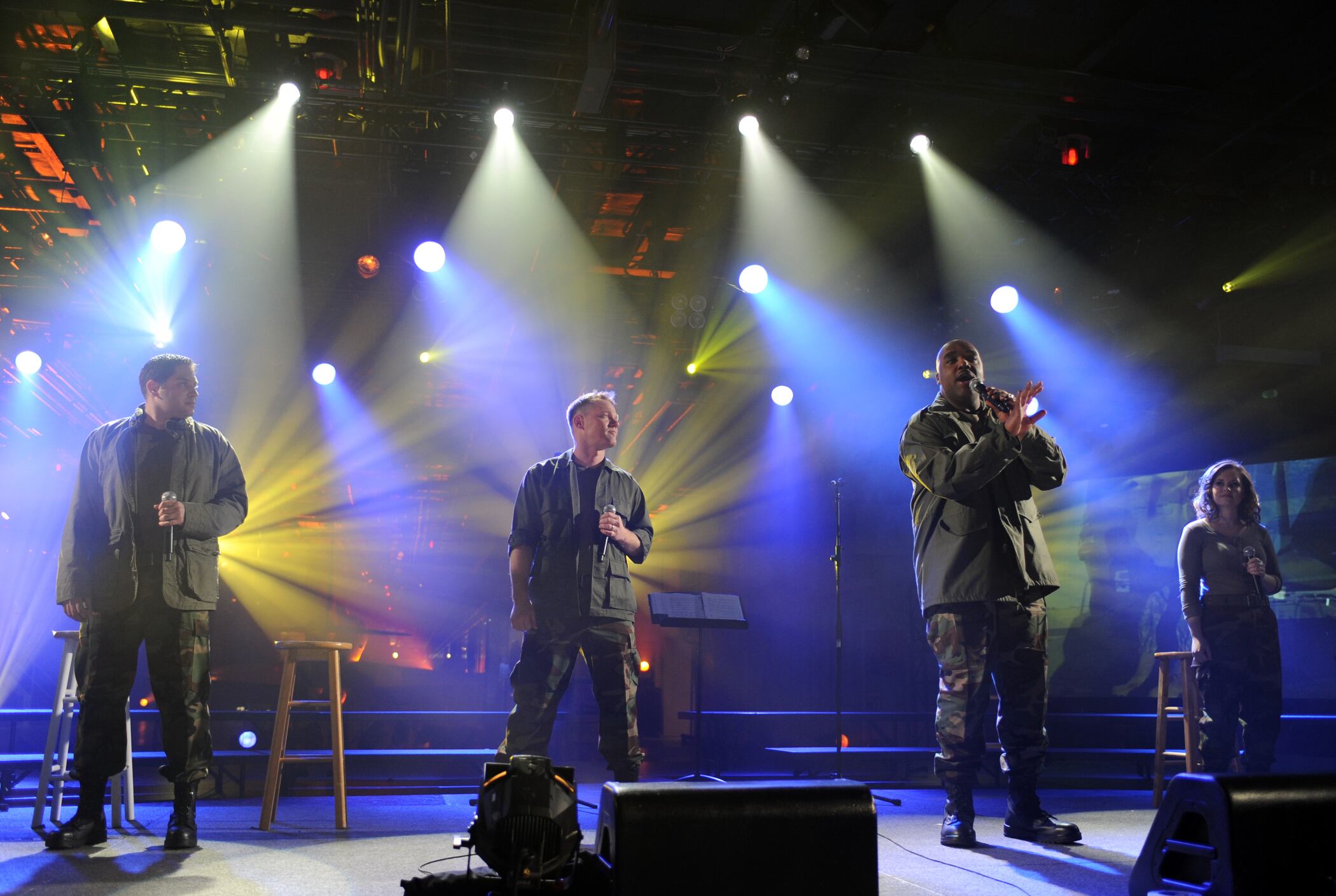 4TROOPS vocalists perform aboard the USS Intrepid in New York City during the taping of a PBS television special. The former soldiers honed their craft in Army Entertainment Division programs run by Army Family, Morale and Recreation Command.