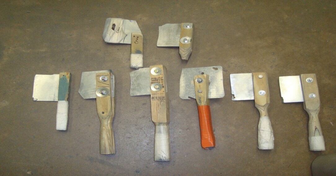 During a surprise inspection, investigators found prison inmates working on combat helmets openly using makeshift tools, like these paint-scraping hatchets, that did not conform to manufacturing requirements, damaged helmets, and presented a risk to those supervising the prisoners.