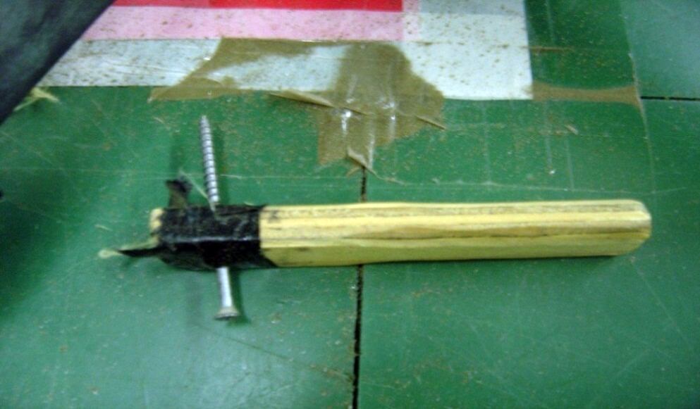 During a surprise inspection, investigators found prison inmates working on combat helmets openly using makeshift tools, like this screw-through-a-stick tool, that did not conform to manufacturing requirements, damaged helmets, and presented a risk to those supervising the prisoners.