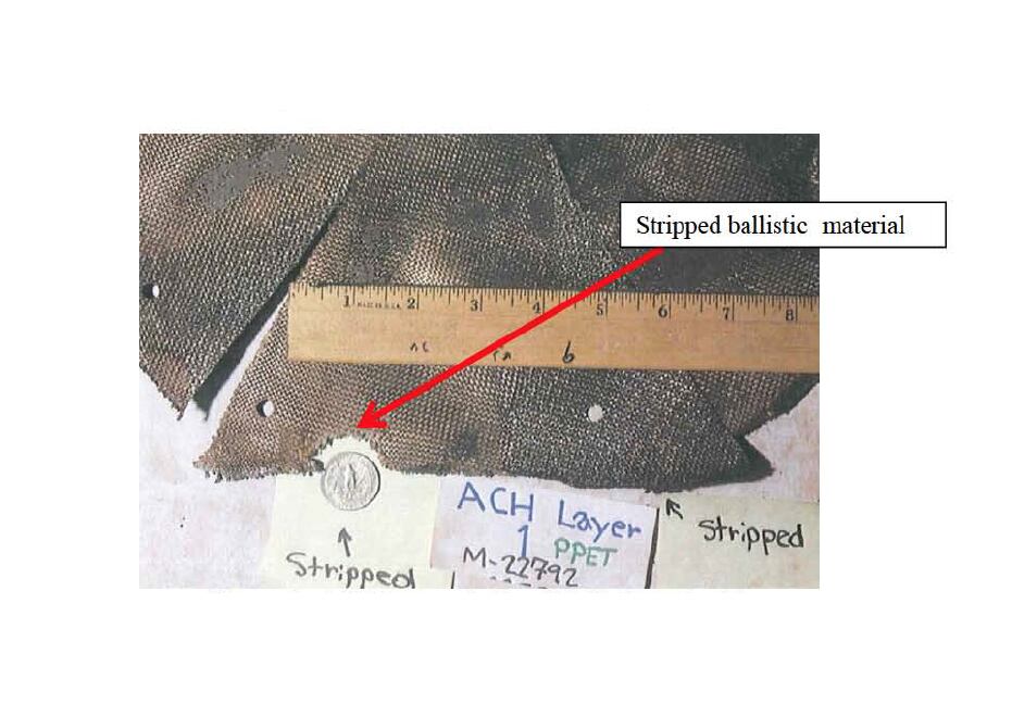 Pictures from a Department of Justice Inspector General report show the damaged ballistic material used to make combat helmets that were ultimately recalled after the discovery of shoddy manufacturing and fraud.