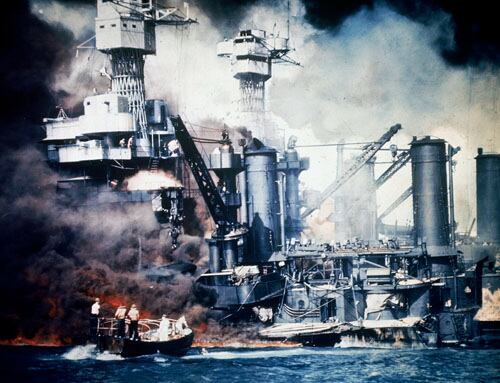 FILE - In this Dec. 7, 1941 file photo, sailors on a small boat rescue a USS West Virginia crew member from the water after the Japanese attack on Pearl Harbor, Hawaii. (AP Photo)