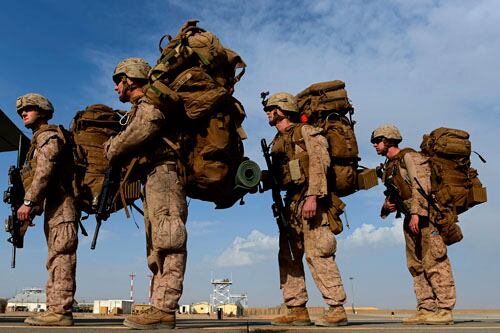 US Marines board a C-130J Super Hercules transport aircraft headed to Kandahar as British and US forces withdraw from the Camp Bastion-Leatherneck complex at Lashkar Gah in Helmand province on October 27, 2014. British forces October 26 handed over formal control of their last base in Afghanistan to Afghan forces, ending combat operations in the country after 13 years which cost hundreds of lives. The Union Jack was lowered at Camp Bastion in the southern province of Helmand, while the Stars and Stripes came down at the adjacent Camp Leatherneck -- the last US Marine base in the country. AFP PHOTO/WAKIL KOHSAR