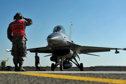 Master Sgt. Joe Ray, a weapons loader assigned to the 180th Fighter Wing, Ohio Air National Guard, salutes as Capt. Justin Kreischer, an 180th FW F-16 Fighting Falcon pilot, prepares to take off for a training sortie at Kecskemet Air Base, Hungary. (Senior Master Sgt. Beth Holliker/Air Force)