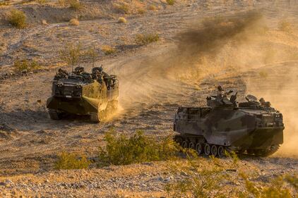 Marines drive amphibious assault vehicles across the desert at Marine Air Ground Combat Center Twentynine Palms, Calif., July 15, 2017. (Cpl. Justin Huffty/Marine Corps)