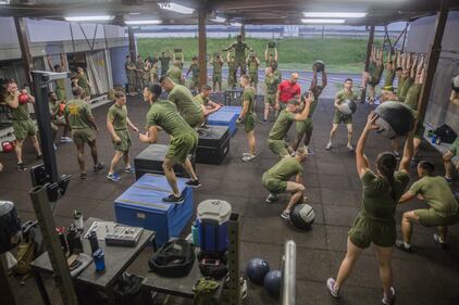 Marines participate in a physical fitness training session at Marine Corps Air Station Iwakuni, Japan, July 18, 2017. (Lance Cpl. Carlos Jimenez/Marine Corps)