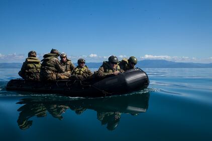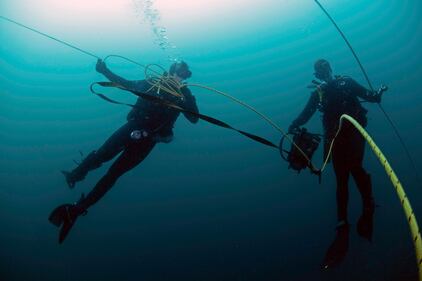 Explosive ordnance disposal technicians assigned to Explosive Ordnance Disposal Mobile Unit (EODMU) 5, Platoon 502, dive in Japan's Mutsu Bay during the 2JA Mine Countermeasure Exercise (2JA MCMEX).on July 18. (MC2 Alfred A. Coffield/Navy)