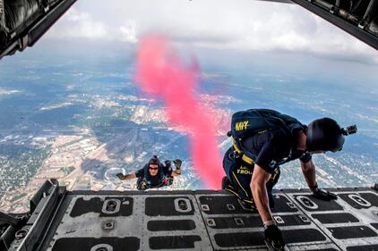 Members of U.S. Navy Parachute Team "The Leap Frogs," jump from a C-130 Hercules aircraft during a skydiving demonstration at the Summer X Games in Minneapolis, July 15, 2017. (PO3 Class Kelsey L. Adams/Navy)