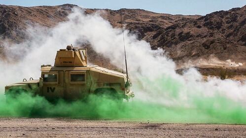 Marines provide cover fire for their convoy with an M240B machine gun during a Motorized Fire and Movement Exercise at Marine Corps Air Ground Combat Center, Twentynine Palms, Calif., July 23, 2017. (Sgt. Kassie L. McDole/Marine Corps )