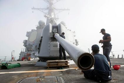 Sailors perform maintenance on the 5-inch gun aboard the Arleigh Burke-class guided-missile destroyer USS Ross (DDG 71) on July 25. (MC3 Robert S. Price/Navy)