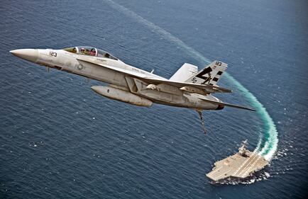 An F/A-18F Super Hornet assigned to Air Test and Evaluation Squadron (VX) 23 flies over the aircraft carrier USS Gerald R. Ford on July 28. (Erik Hildebrandt/Navy)