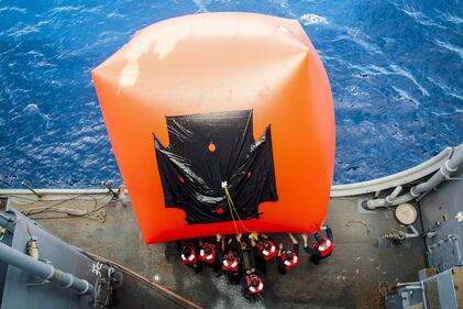Sailors push a type of inflatable target known as a "killer tomato" off the USS Rushmore during a live-fire exercise off the coast of Southern California, Aug. 2, 2017, while training for future operations and deployments. (PO2 Jesse Monford/Navy)