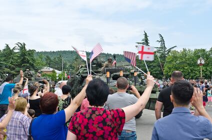 Local residents of Khashuri, Georgia welcome the U.S. Army’s 2nd Cavalry Regiment on July 31, 2017 as they finish the last segment of their movement from Poti, Georgia on the Black Sea to Vaziani Training Area in Georgia to begin exercise Noble Partner. (Capt. John W. Strickland/Army)