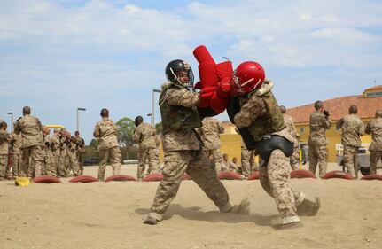 Recruits from India Company, 3rd Recruit Training Battalion, battle each other during Pugil Sticks I at Marine Corps Recruit Depot San Diego, Aug. 2. (Cpl. Angelica Annastas/Marine Corps)