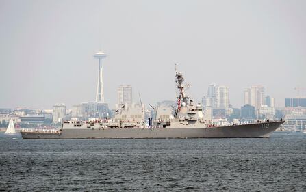 The guided-missile destroyer USS Michael Murphy (DDG 112) sails in a Parade of Ships during Seattle's 68th annual Seafair Fleet Week on Aug. 2. (MC2 Jacob G. Sisco/Navy)
