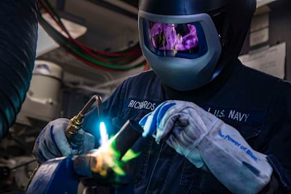 Hull Technician Fireman Jeremiah Richards repairs a pipe aboard the guided-missile destroyer Kidd in the South China Sea July 2. (MC3 Kaylianna Genier/Navy)