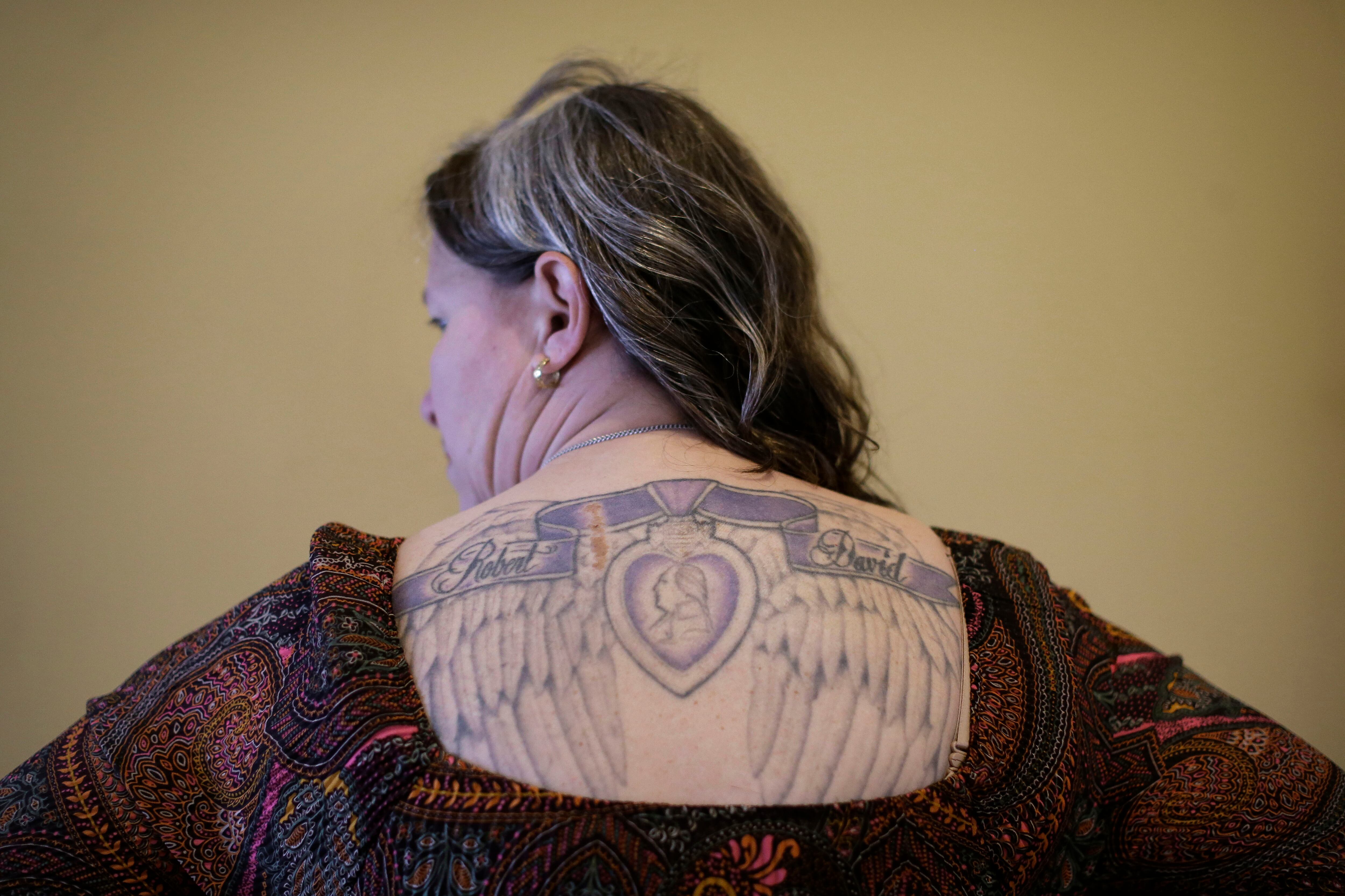 Marine Corps veteran Rosie Noel displays a tattoo depicting her sons' names and a Purple Heart that she was awarded, in her home in Sneads Ferry, N.C. After an abrupt cancellation of an already postponed appointment at the VA hospital in Fayetteville, Noel said she was enraged. "I served my country. I'm combat wounded. And to be treated like I'm nothing is unconscionable," she said.