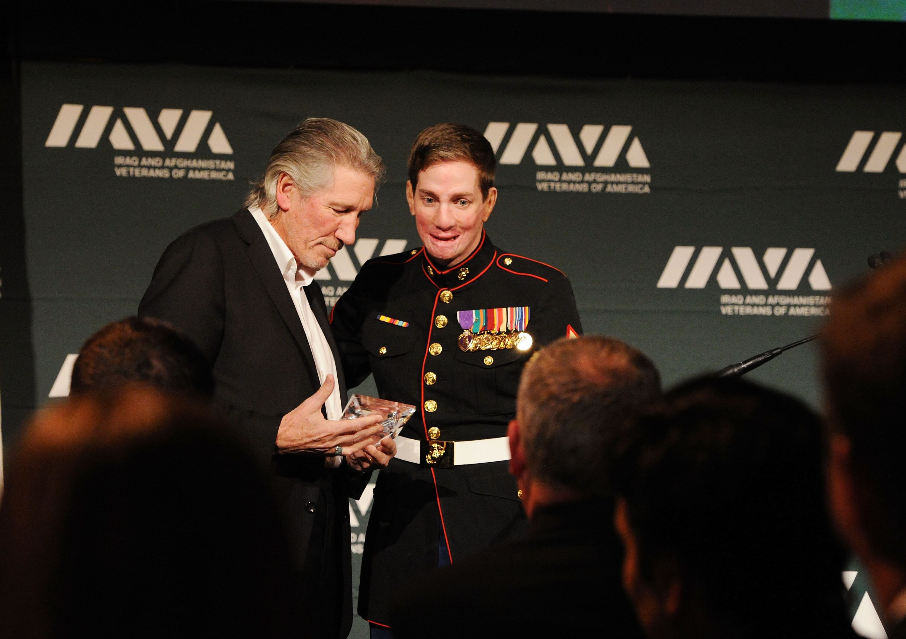 Marine veteran Aaron Mankin presents the Iraq and Afghanistan Veterans of America's Artistic Leadership award to musician Roger Waters in 2012.