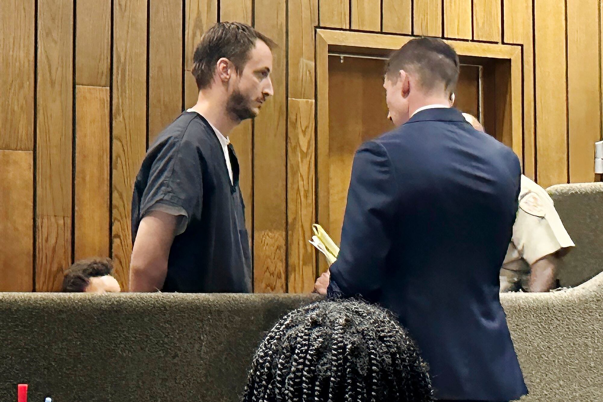 The hearing took place in a courtroom used for cases involving military veterans. Banners from branches of the military hang along the back wall of the courtroom.