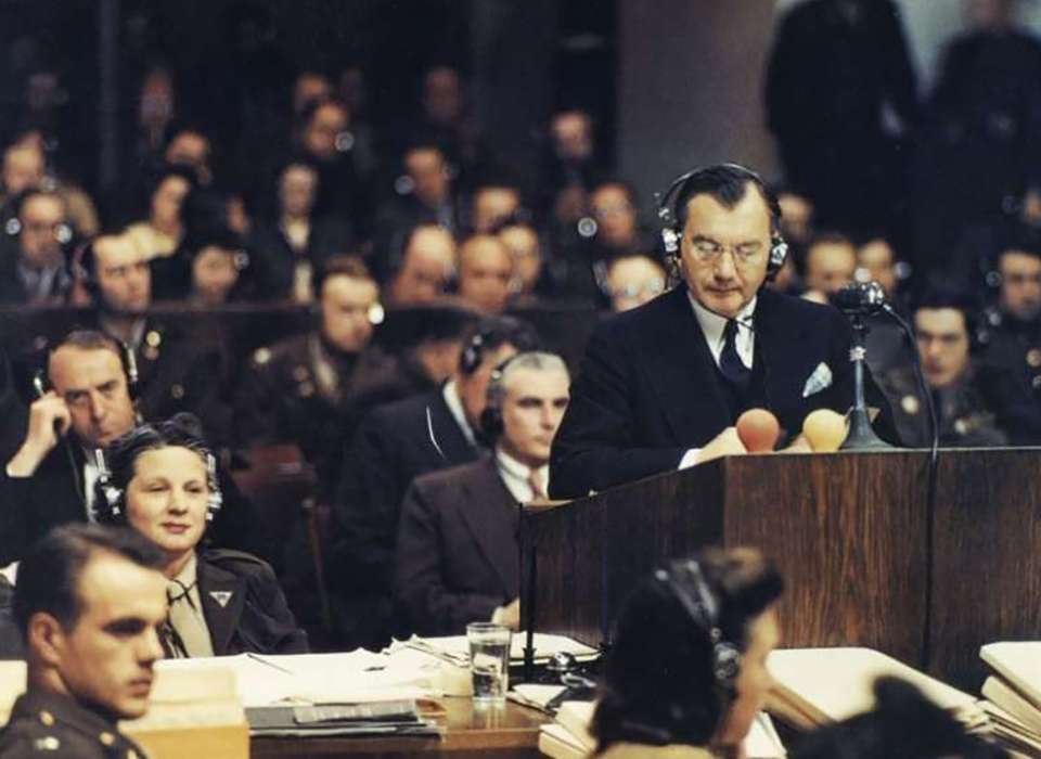 Opening statement at Nuremberg being delivered by Robert H. Jackson. (U.S. Army Signal Corps)