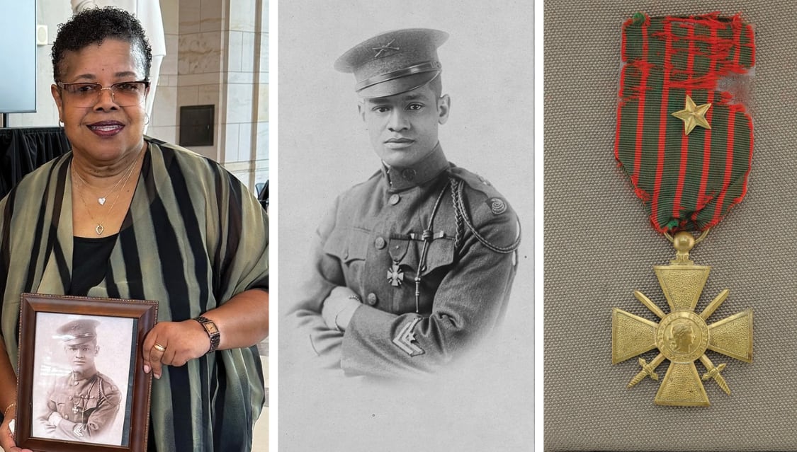 Lawrence McVey (middle), who served with the 369th, was honored with France’s Croix de Guerre after leading an attack that left him wounded. Thanks to the efforts of his granddaughter, Gina McVey (left), the medal now resides at the Smithsonian’s National Museum of African American History and Culture. (Gina McVey/National Museum of African American History and Culture via Canva)